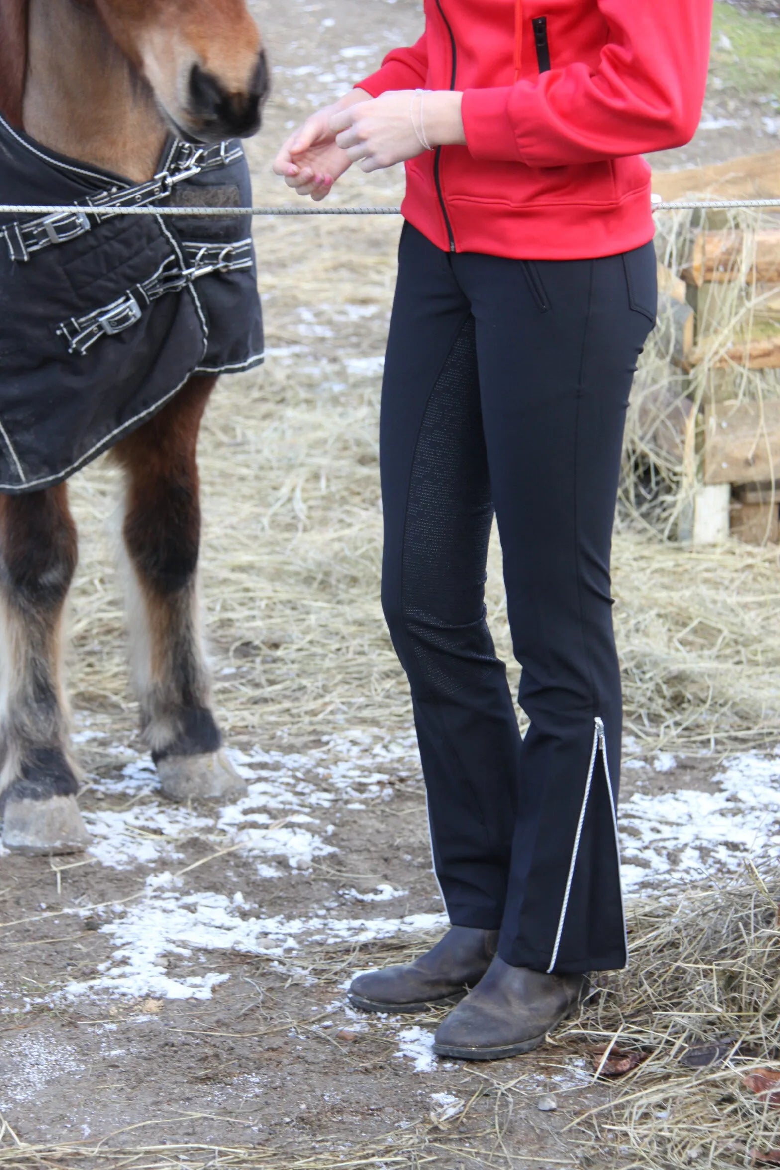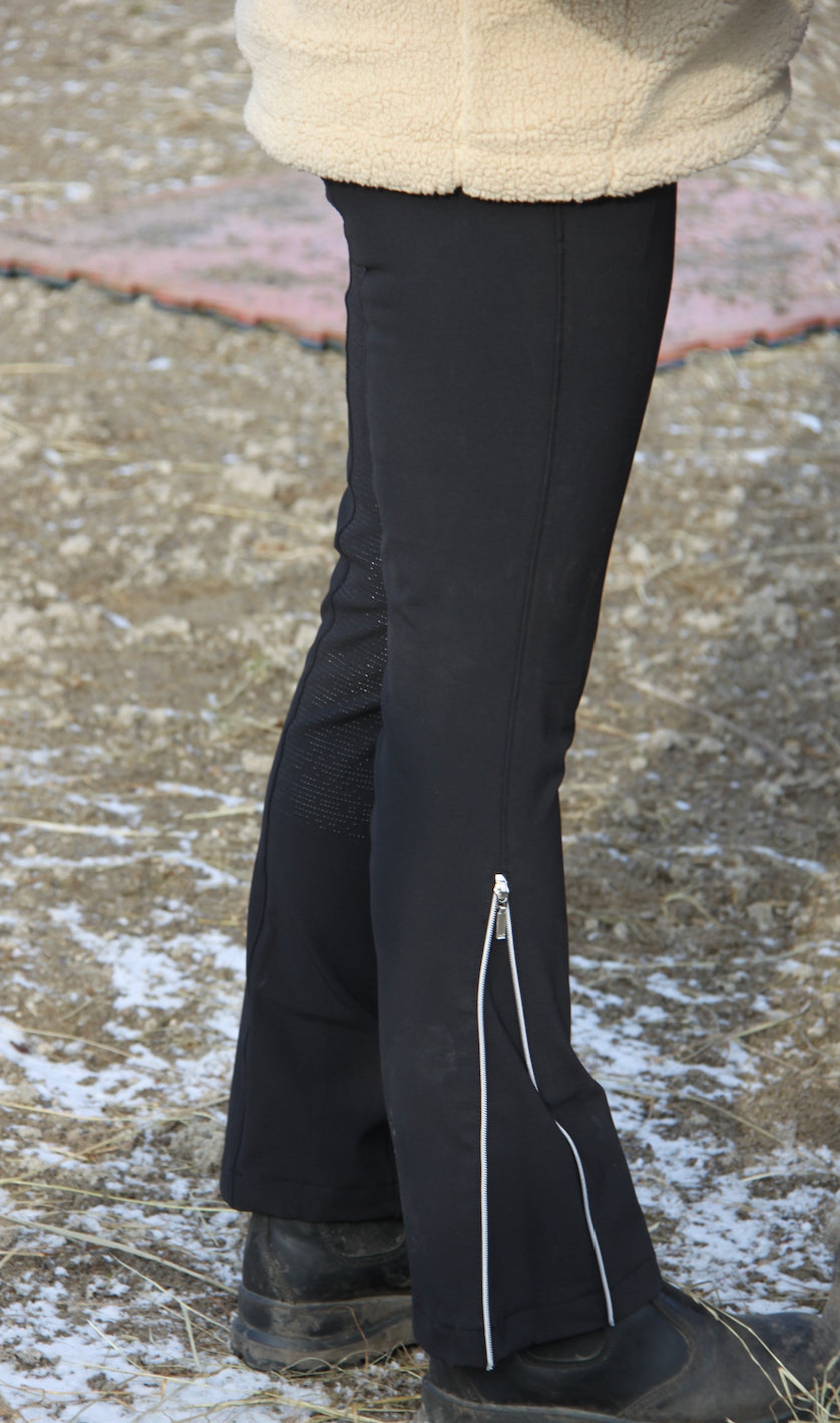 Silikonvollbesatz sorgt für guten Halt im Sattel. Mit moderater Bootcut-Form, die den Stiefeletten Platz bietet. Reißverschluss an den Waden.