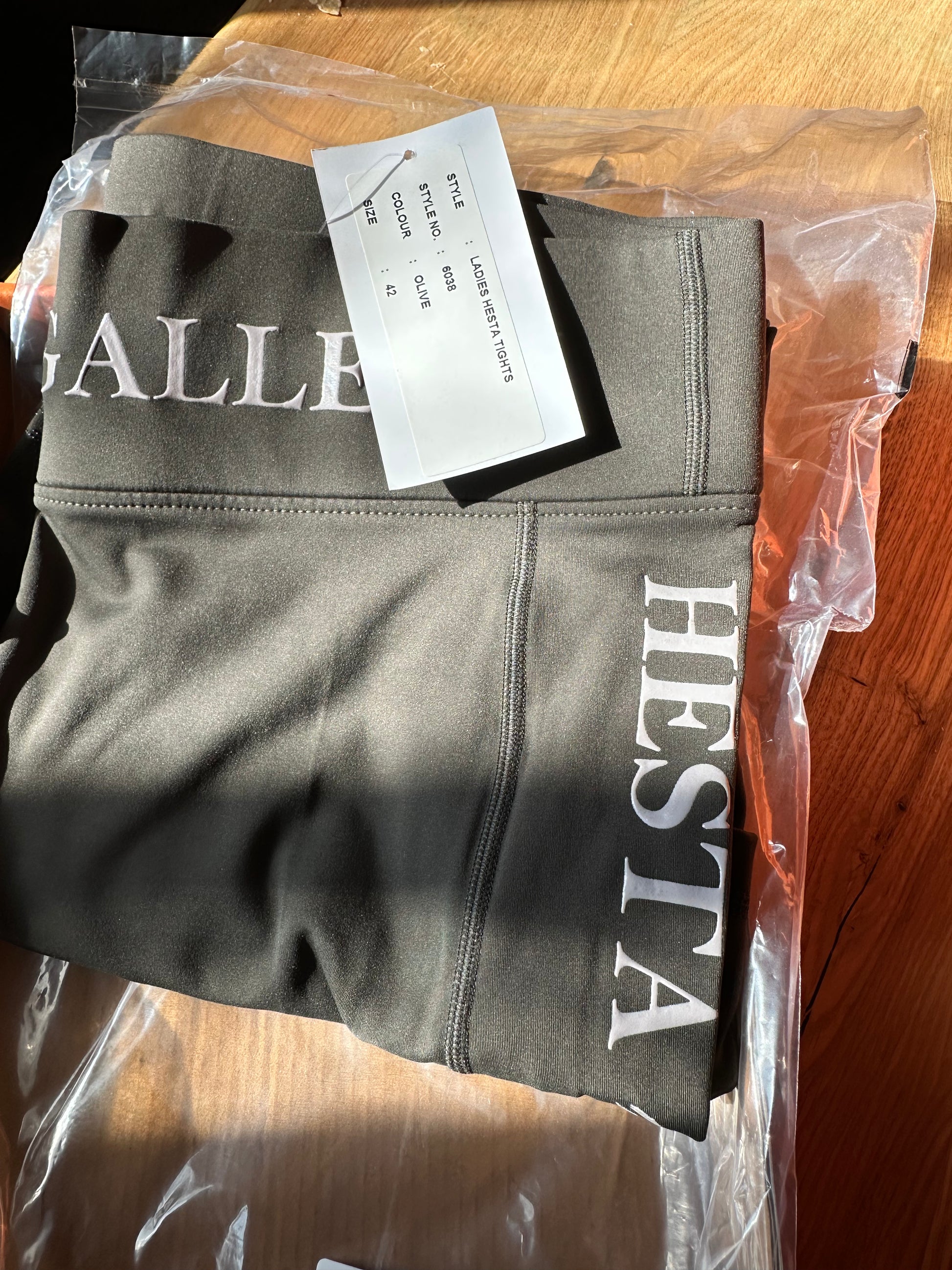 Hestagallery Reitleggings aus Stretchmaterial. Hestagallery Silikondruck auf dem elastischen Bund und am linken Bein. Logo mit Silikondruck auf der Tasche am rechten Bein.