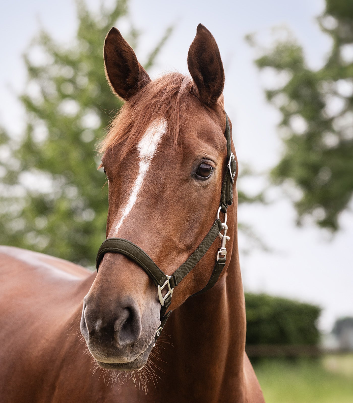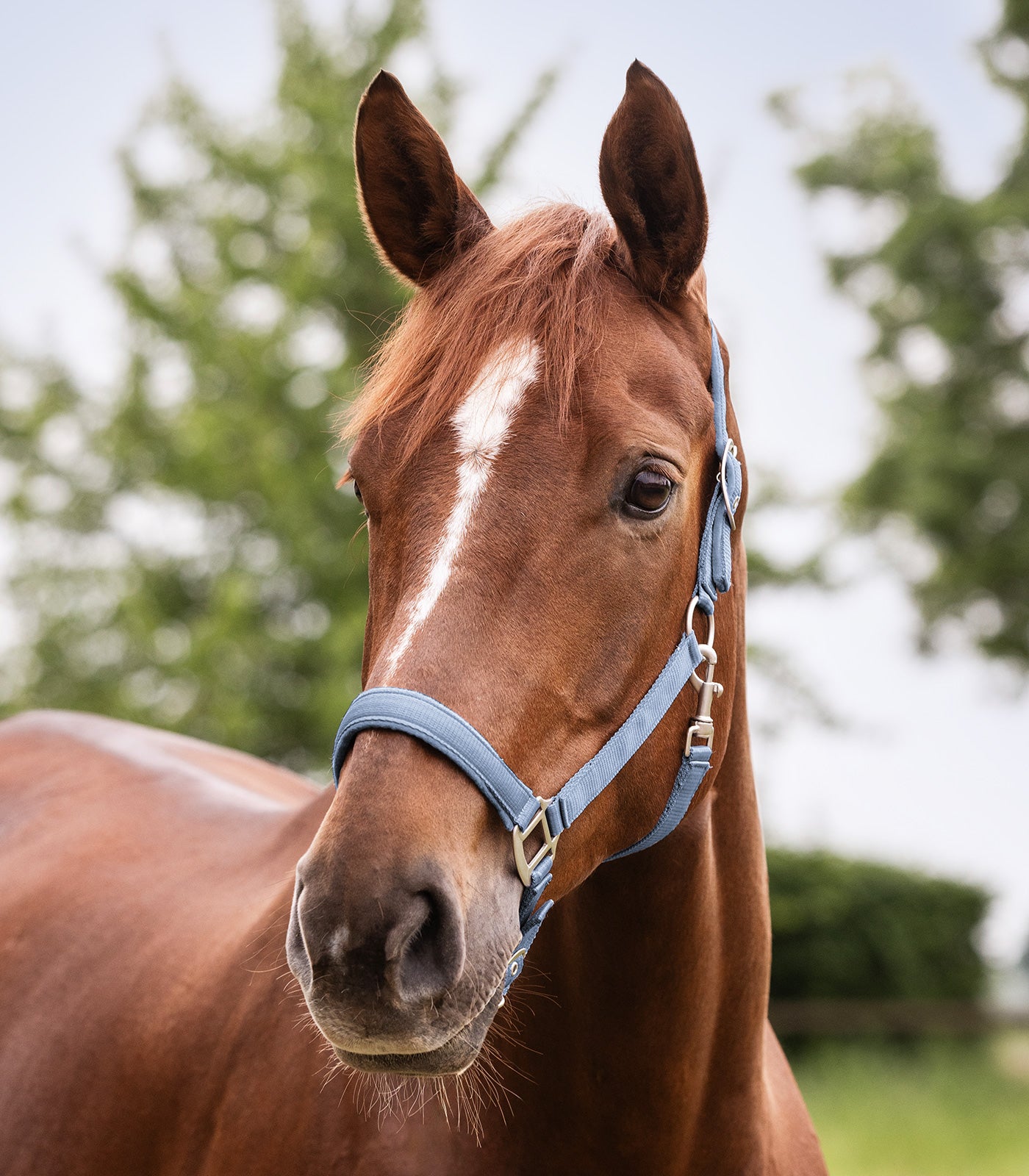 Weich unterlegtes Halfter, mehrfach verstellbar. Mit mattierten Beschlägen. Passend zu Anbindestrick Plus.